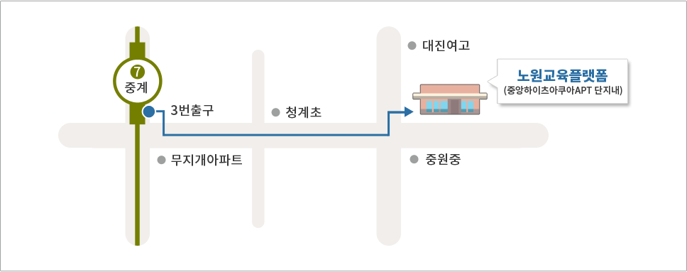 | 지하철 | 7호선 중계역 3번 출구로 나와서 첫 사거리에서 왼쪽(청계초 방면)으로 200미터 정도 걸어오셔서, 청계초 맞은편 '중앙하이츠아쿠아 아파트' 단지로 오시면 됩니다. 단지 내 1층에 노원교육플랫폼 건물이 있습니다. |